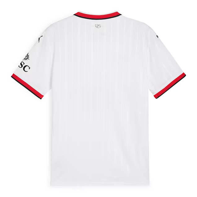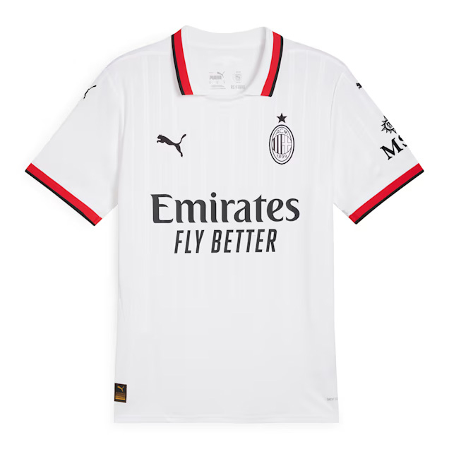 Na obrázku je biely futbalový dres značky Puma s logom AC Milan. Na prednej strane je logo sponzora Emirates s nápisom „Fly Better“.