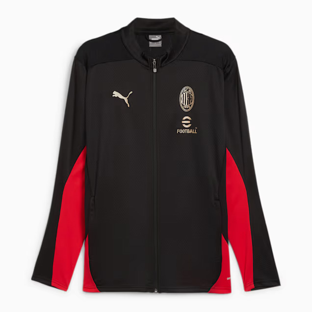 Na obrázku je čierna športová bunda pre futbalových fanúšikov. Na ľavej strane hrude je logo značky Puma, ktoré symbolizuje kvalitu a výkonnosť. Uprostred hrude dominuje logo slávneho futbalového klubu AC Miláno. Pod logom AC Miláno je nápis "FOOTBALL".