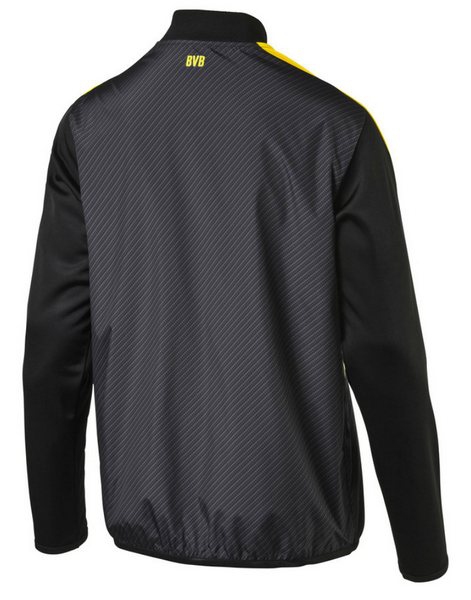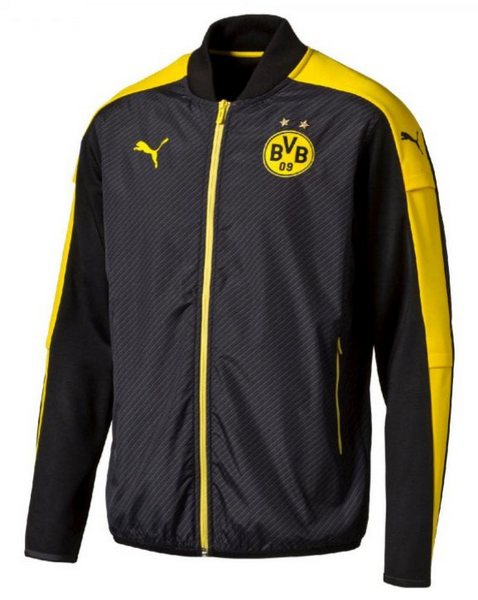 Čierna pánska bunda so žltým zapíváním na zips Cup stadium od značky Puma. Na prednej strane je logo BVB a logo výrobcu Puma v žltej farbe. Bunda má dve vrecká na zipsové zapínanie, zips je v žltej farbe. Na rukávoch bundy je pruh v prostred, rukávy potom zdobí logo Puma v čiernej farbe.