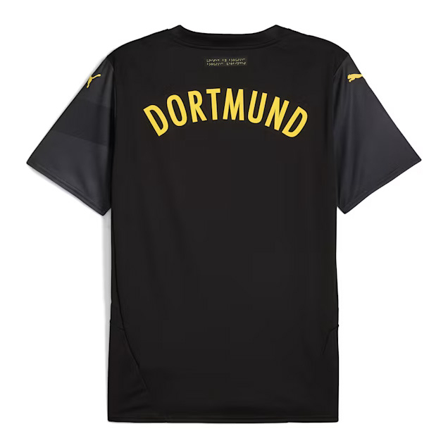 Na obrázku je čiernožltý futbalový dres s logom futbalového tímu Borussia Dortmund a sponzorom "1&1" na prednej strane. Dres má tiež logo značky výrobcu Puma, ktoré je umiestnené na prednej strane dresu a rukávoch.