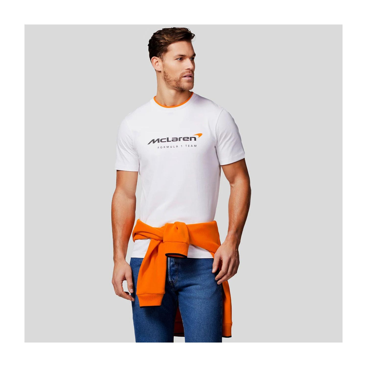 Na obrázku je biele tričko s krátkym rukávom. Na tričku je logo a čierny nápis "McLaren" a pod ním text "FORMULA 1 TEAM." Tričko má pri krku oranžový detail, ktorý dodáva kontrastný prvok k celkovému dizajnu.